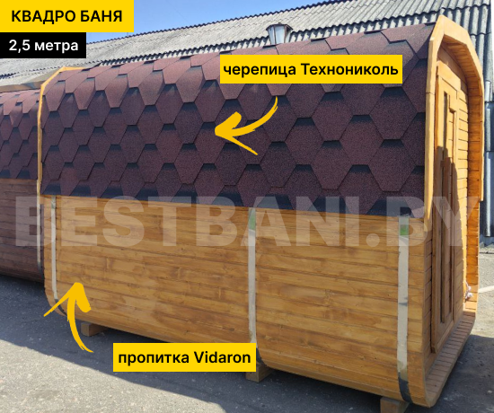 Квадро-баня 2,5 м — компактная квадро-бочка, но более просторная баня для комфортного парения 2–4 человек. За счёт увеличенной длины она остаётся удобной для небольших участков, но внутри даёт больше свободы: одно удлинённое помещение совмещает в себе парную и небольшую зону отдыха. Квадро-баня быстро прогревается до 90–100 °C примерно за 1,5–2 часа и подходит для круглогодичного использования на даче или возле загородного дома.