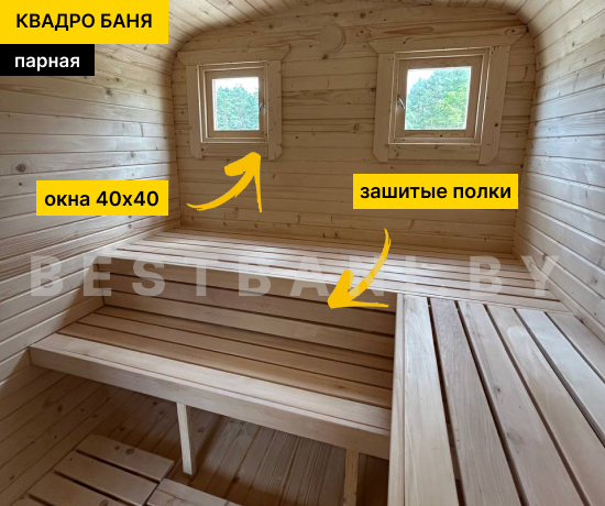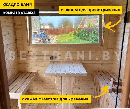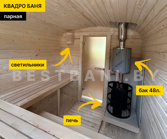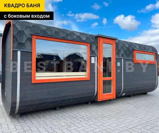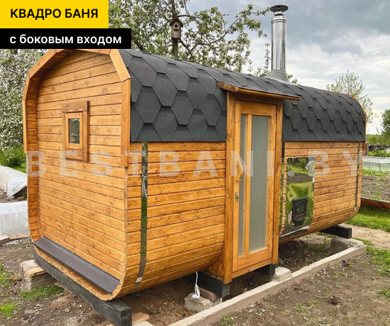 4 метровая квадро-баня с боковым входом — практичное решение для комфортного парения и удобной организации пространства на участке при условии всесезонной эксплуатации. Боковой вход позволяет гибко разместить баню относительно дома, забора или других построек, а также удобно организовать подход к парной без необходимости оставлять свободное пространство по торцу. Квадро-баня быстро выходит на рабочую температуру 90–100 °C в среднем за 1,5–2 часа при экономичном расходе дров или электроэнергии.