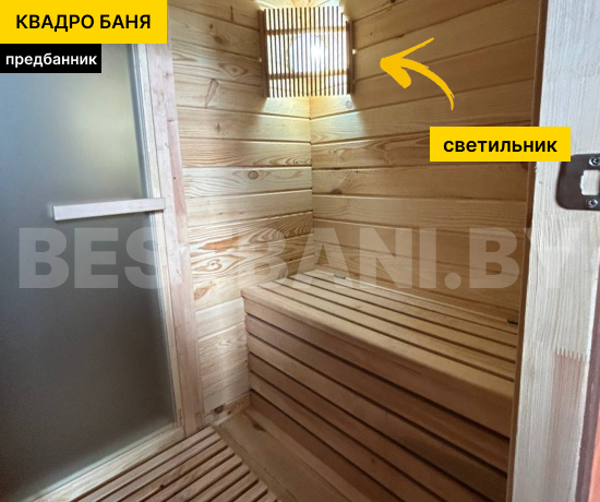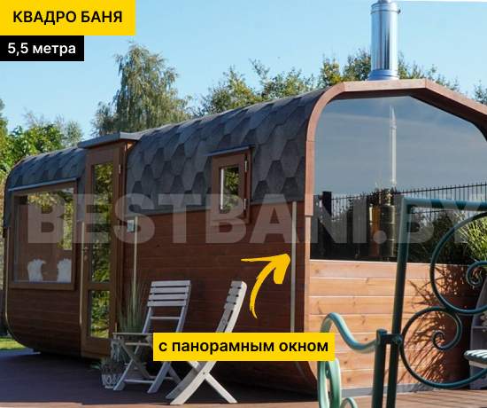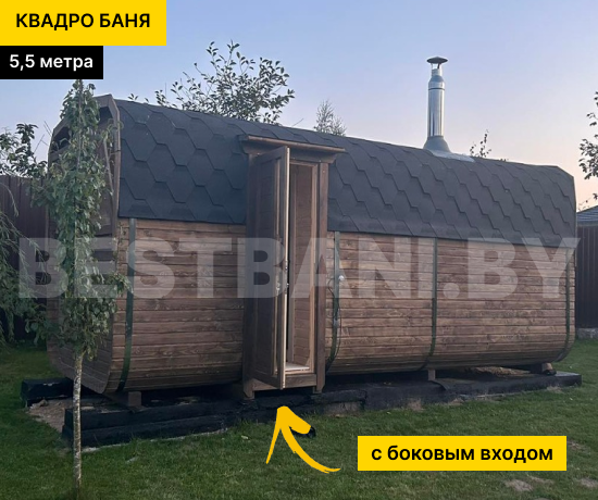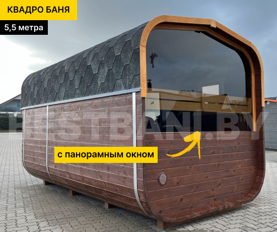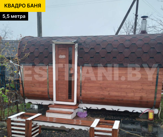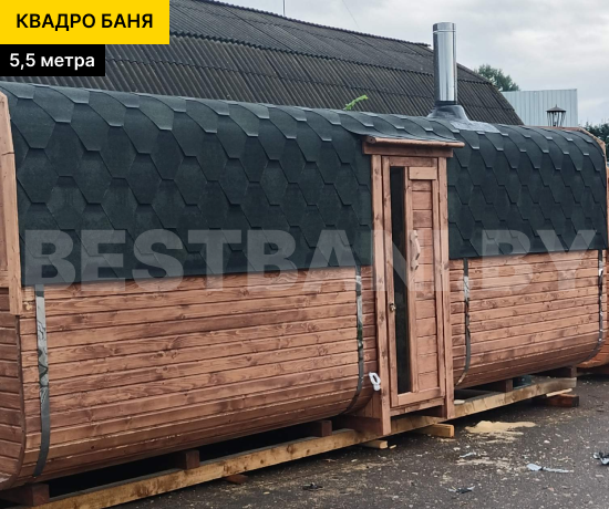 Квадро-баня 5,5 м — просторная баня для тех, кто хочет максимум комфорта, пара и отдыха в одном компактном модуле без капитального строительства. Такая баня комфортно вмещает 4–8 человек и отлично подойдёт для большой семьи или компании друзей. За счёт длины в 5,5 метра, баня даёт больше свободы в планировке: можно сделать 2 или 3 помещения — от классической схемы «парная + предбанник» до варианта с отдельной моечной и комнатой отдыха. Квадро-баня быстро прогревается до рабочих 90–100 °C примерно за 1,5–2 часа и держит мягкий, плотный пар.