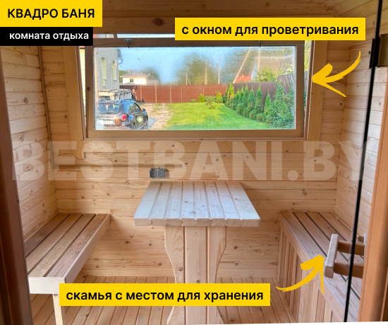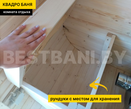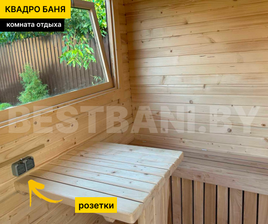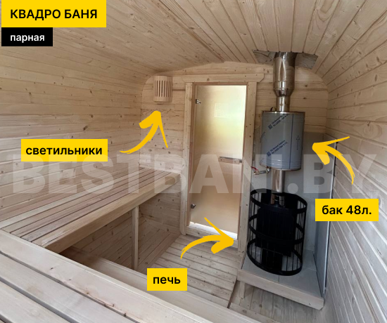 Снаружи квадро-бочка выглядит современно и аккуратно: фирменная геометрия, ровные линии, возможность выбора цвета пропитки и кровли, установка обычных или панорамных окон, добавление навеса или компактной террасы. Такая квадро-баня одинаково гармонично смотрится и рядом с современным коттеджем, и на классической даче. Поставляется в готовом виде и устанавливается на ровную площадку без капитального фундамента — после монтажа, можно сразу идти на первый пар.