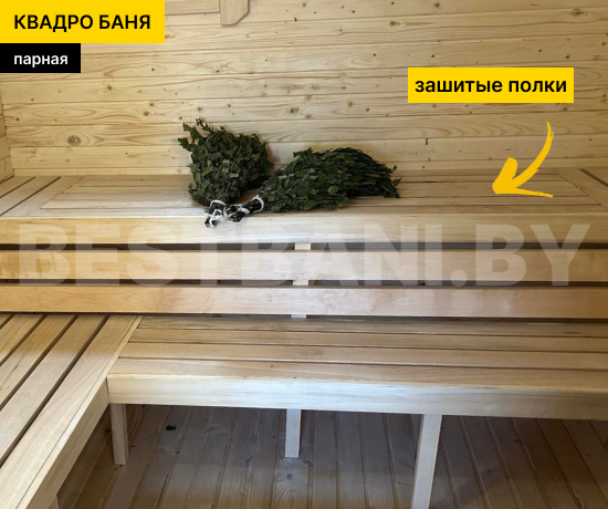 Каркас выполняется из ели толщиной 47–50 мм по финской технологии «лунный паз». Плотно подогнанный брус не продувается, надёжно удерживает тепло и при этом «дышит»: древесина впитывает влагу во время парения и выводит её после остывания. Благодаря этому квадро-бочка служит долгие годы, сохраняет геометрию, тепло и натуральный древесный аромат. Снаружи покрывается защитной пропиткой, которая оберегает древесину от влаги, грибка и насекомых, продлевая срок службы.