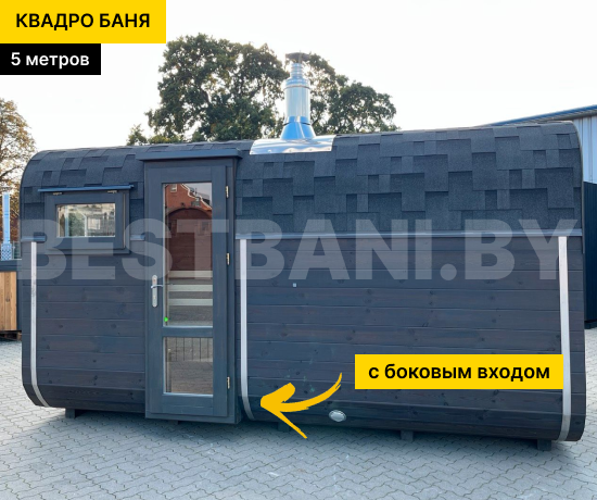 Квадро баня 5 м — это уже полноценная баня семейного формата. Она комфортно вмещает 4–6 человек, подходит для круглогодичного использования у дома или на даче и даёт больше свободы в планировке: можно сделать 2 или 3 помещения — от классической схемы «парная + предбанник» до варианта с отдельной моечной и комнатой отдыха. Квадро-баня быстро прогревается до рабочих 90–100 °C примерно за 1,5–2 часа и держит мягкий, плотный пар.