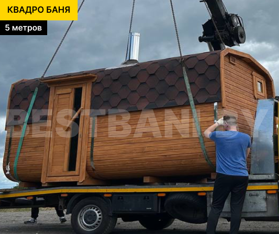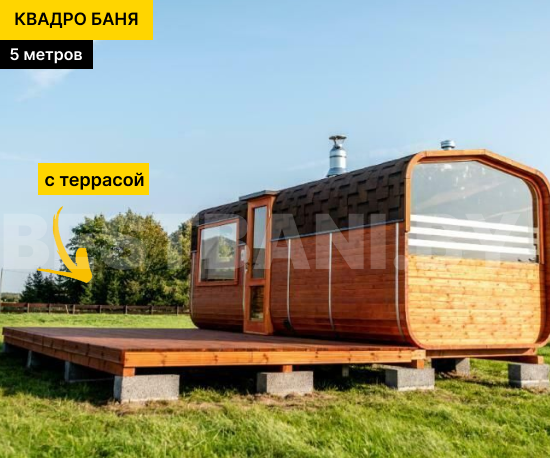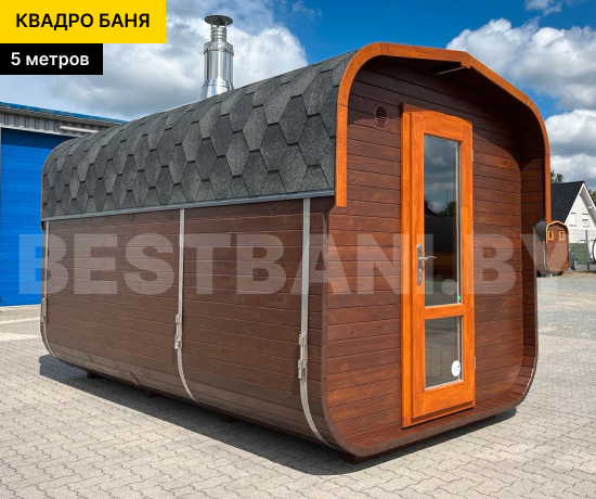 Снаружи 5 метровая квадро-баня бочка смотрится аккуратно и современно: фирменная геометрия, ровные линии, возможность выбрать цвет пропитки и кровли, добавить обычные или панорамные окна, небольшой навес или террасу. Наша баня квадро-бочка поставляется в готовом виде и устанавливается на ровную площадку без капитального фундамента — после монтажа, можно сразу идти на первый пар.