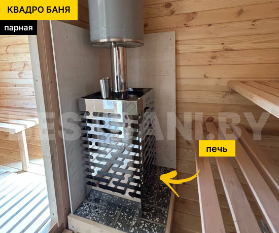 Мебель, полки и трапы выполняются из ольхи класса «Экстра» — это комфортный, красиво выглядящий и долговечный материал, идеально подходящий для бани квадро-бочки. Устанавливается дровяная печь — для атмосферного «живого» пара и треска поленьев.