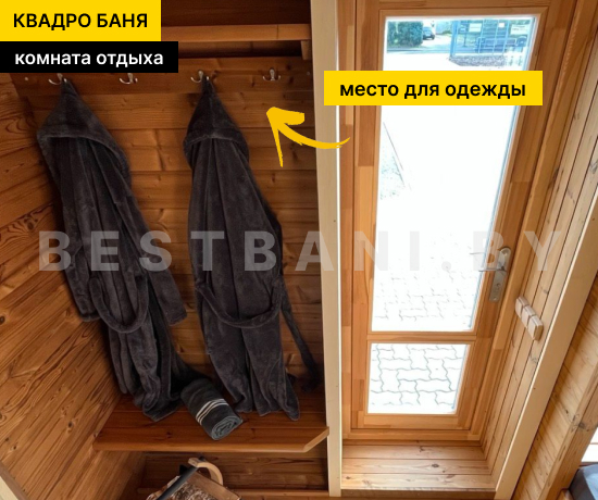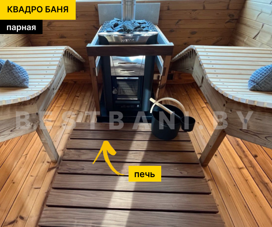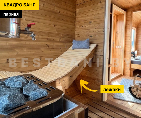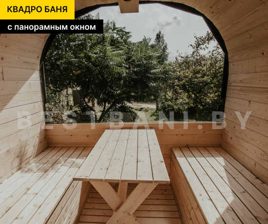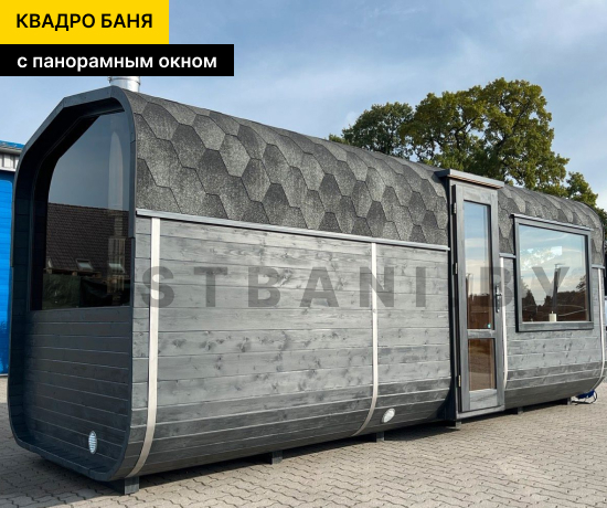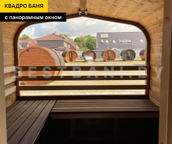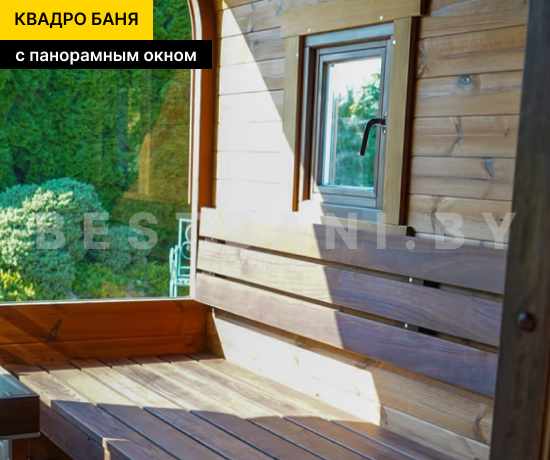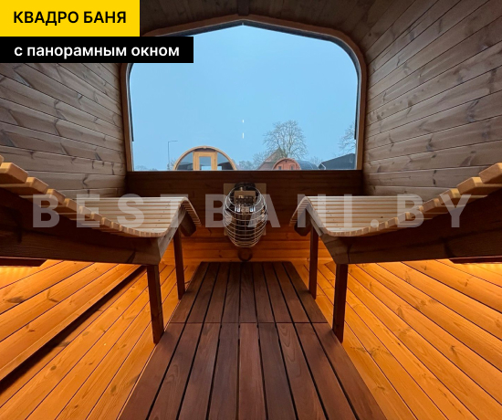 Квадро-баня с панорамными окнами выпускается в вариантах длиной от 3,5 до 6 метров — практичное решение для комфортного парения и отдыха на участке при условии всесезонной эксплуатации. Панорамное остекление визуально расширяет пространство, наполняет интерьер естественным светом и позволяет наслаждаться видом участка или природного окружения, не нарушая приватности зоны парения. В зависимости от длины квадро-баня выходит на рабочую температуру 90–100 °C в среднем за 1,5–2 часа при экономичном расходе дров или электроэнергии.