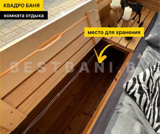 Внутреннее пространство продумано для комфортного использования в любое время года. Планировка может включать две или три зоны. Полки, мебель и трапы выполняются из ольхи класса «Экстра»: она не обжигает кожу, не смолится и сохраняет аккуратный внешний вид даже при регулярном использовании. Панорамные окна устанавливаются с учётом теплотехнических требований и не влияют на стабильность температурного режима внутри бани.