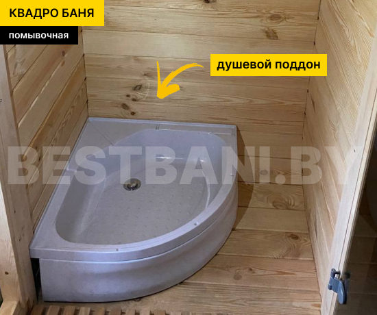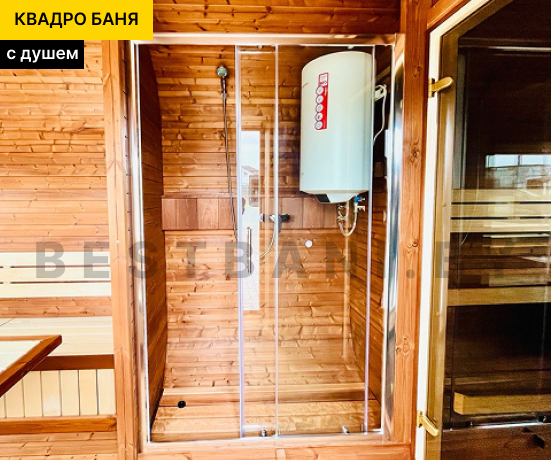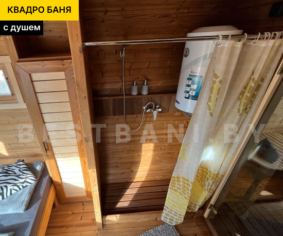 Душ обычно делают на акриловом поддоне с сифоном, чтобы не тянуло холодом и не было запахов из канализации. Воду можно подавать от бойлера, проточного водонагревателя или классического бака на дымоходе — баня легко адаптируется под ваш вариант. Санузел отделяется перегородкой и дверью, возможна установка унитаза и раковины, при необходимости — матовых дверей для приватности. Канализация и вода подводятся к квадро-бане заказчиком, а внутри всё уже подготовлено под подключение.