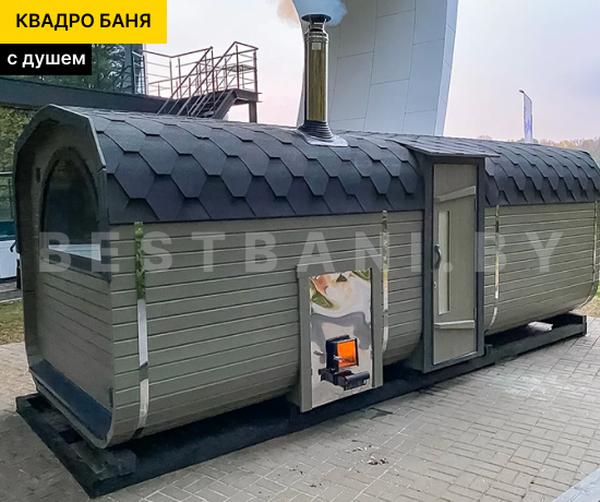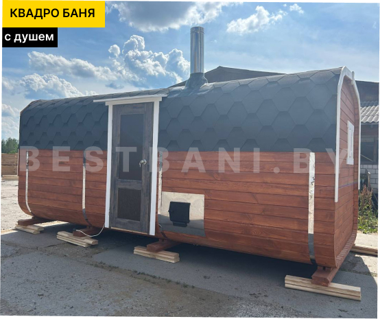 Баня квадро-бочка с санузлом и душем — это уже полноценный банный домик, где есть всё: парная, душевая, санузел и комната отдыха. Такая баня удобно встаёт на участок у дома или дачи и при длине от 5 до 6 метров комфортно вмещает 4–6 человек. Вам не нужно бегать в дом после парения — уже есть душ и санузел, всё компактно собрано в одном тёплом модуле.
