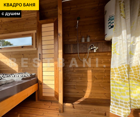 Комната отдыха в такой квадро-бане остаётся комфортной даже с душем и санузлом: здесь можно поставить стол, лавки, разместить вешалки и полки для вещей, при желании — предусмотреть спальное место. Парная остаётся полноценной: удобные полки разного уровня, мягкий или более интенсивный пар, комфортный объём для 4–6 человек.